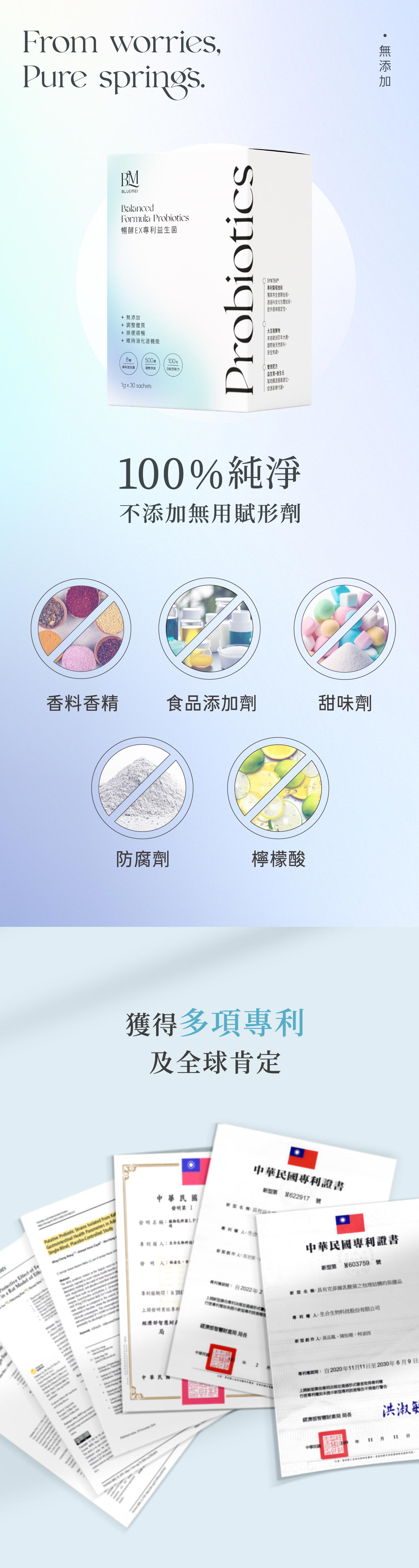 篩選超過2000株菌株,透過15種模組化平台交叉驗證,分析出最佳的「菌種比例」!並採用台灣唯一的「AB Kefir 共生發酵技術」,讓菌株之間相互作用,產生出更多有益人體的「維生素」,以及超過28種「游離胺基酸」等營養物質!