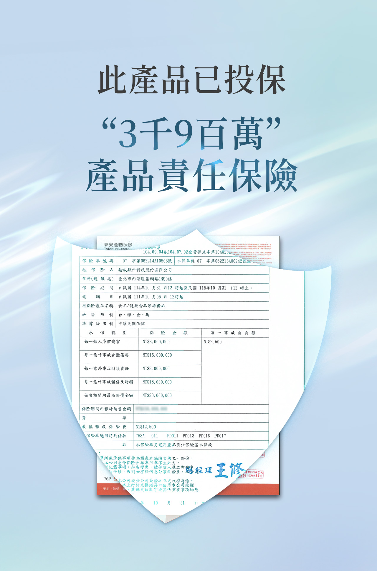 - 注意事項本產品已投保產品責任險新台幣3000萬元整。﹡投保金額不等同理賠金額